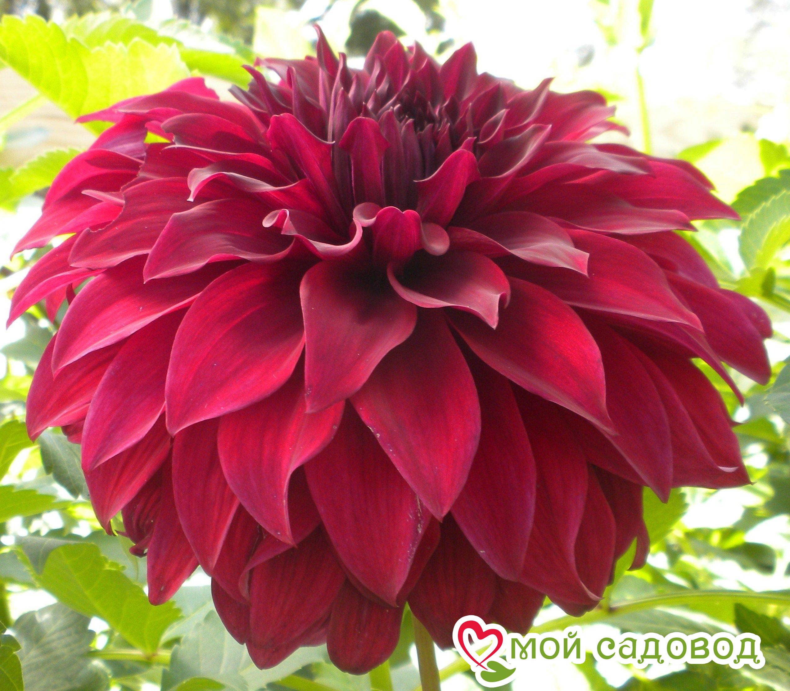 Георгины обычно достигают высоты 90 – 120 см. У этого сорта прочные и прямостоячие стебли. Они обычно достаточно жесткие, чтобы держать цветы вертикально. Листья зеленого цвета, плотные, размером 10 – 15 см. Цветы крупные и очень яркие, уникальной формы. Обычно они имеют махровую или полумахровую структуру с множеством слоев плотных лепестков, образуя шарообразные соцветия. Лепестки могут быть изогнутыми или волнистыми. Окрас – темно-красный. Цветение длится до осени.